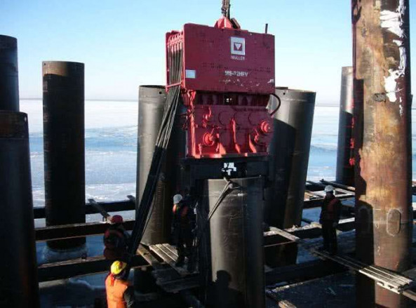 Вибропогружение трубы и шпунтовых свай при строительстве временного моста, выполненное специалистами «АрктикГидроСтрой»